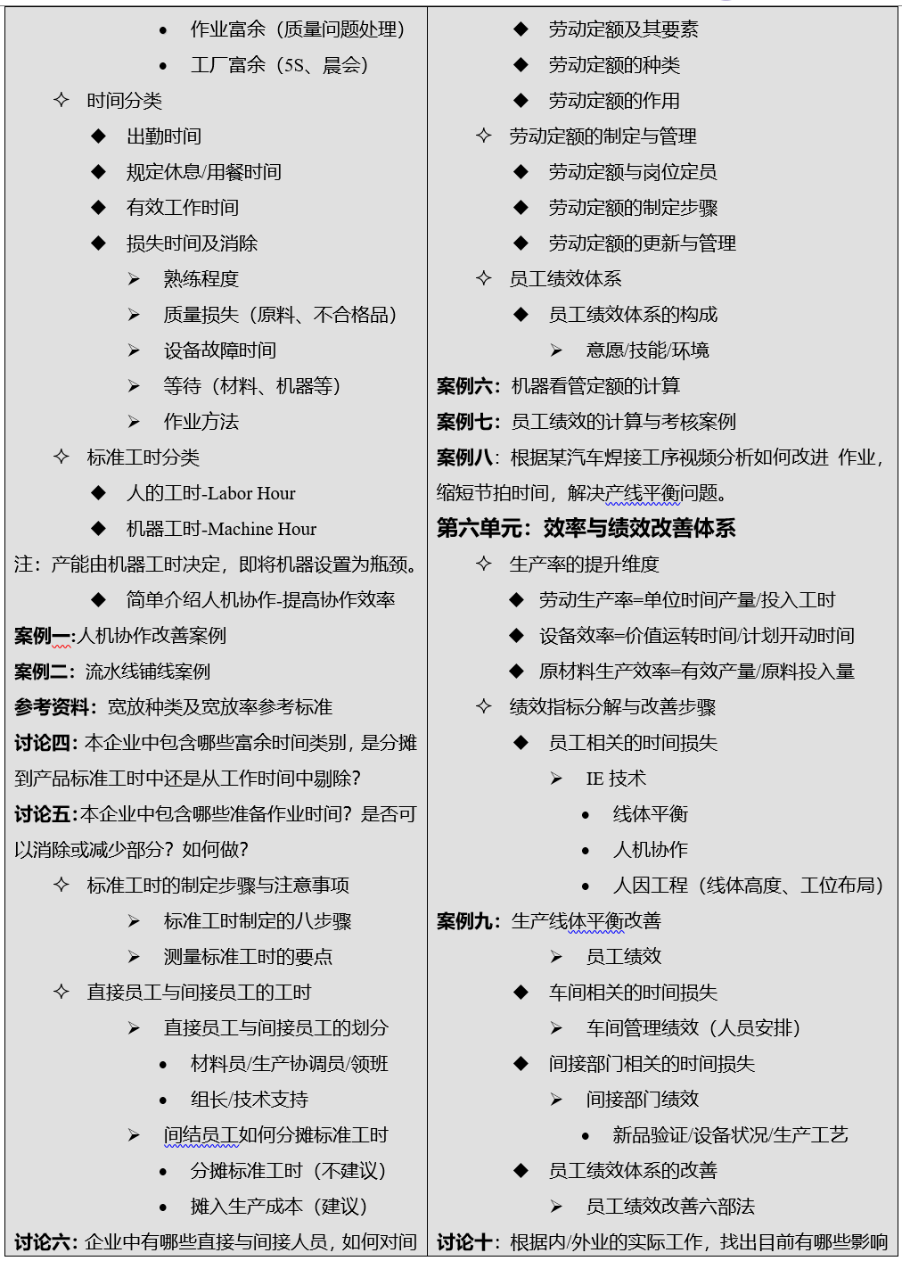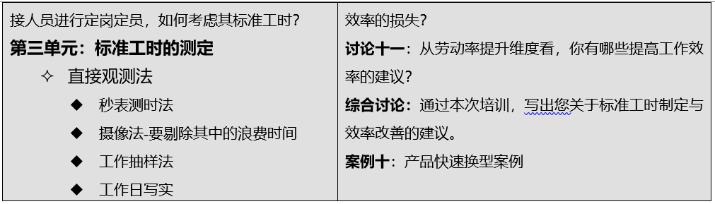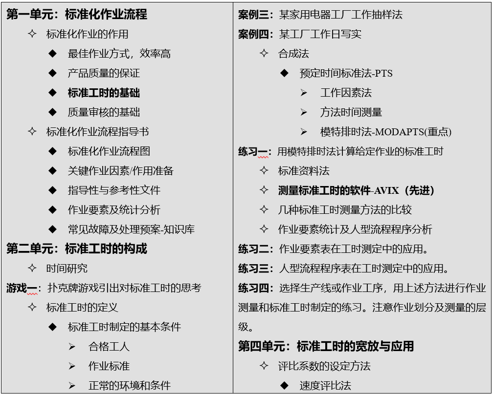 幫助企業(yè)建立科學(xué)的標(biāo)準(zhǔn)工時制定方法,合理制定勞動定額,為企業(yè)合理考評員工績效提供數(shù)據(jù)基礎(chǔ),并提供系統(tǒng)改善作業(yè)效率的方法。課程中穿插大量討論、練習(xí)及案例。(*好能事先由企業(yè)提供部分案例或提前到現(xiàn)場研究)